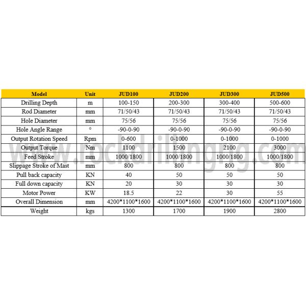 Series JUD—underground drilling rig is a full hydraulic operated top drive power head drilling machine and is used for core drilling of geological exploration in tunnel.